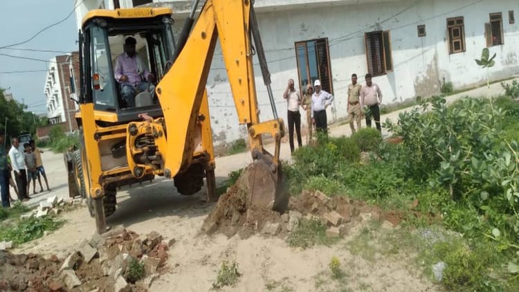 शारदा सिटी में अवैध निर्माण ध्वस्त करता बुलडोजर