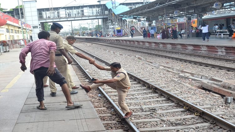 प्लेट फार्म नंबर दो पर रेलवे ट्रैक पार कर रहा आरपीएफ कर्मी